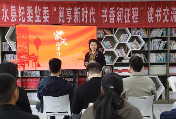 河南省周口市商水县纪委监委以书香涵养家风,以家风促建廉风,通过举办“家风故事分享会”,引导干部在品读经典、交流互鉴中夯实廉洁根基。图为纪检监察干部分享家风故事,交流感悟。(河南省周口市商水县纪委监委 童威威 摄)
